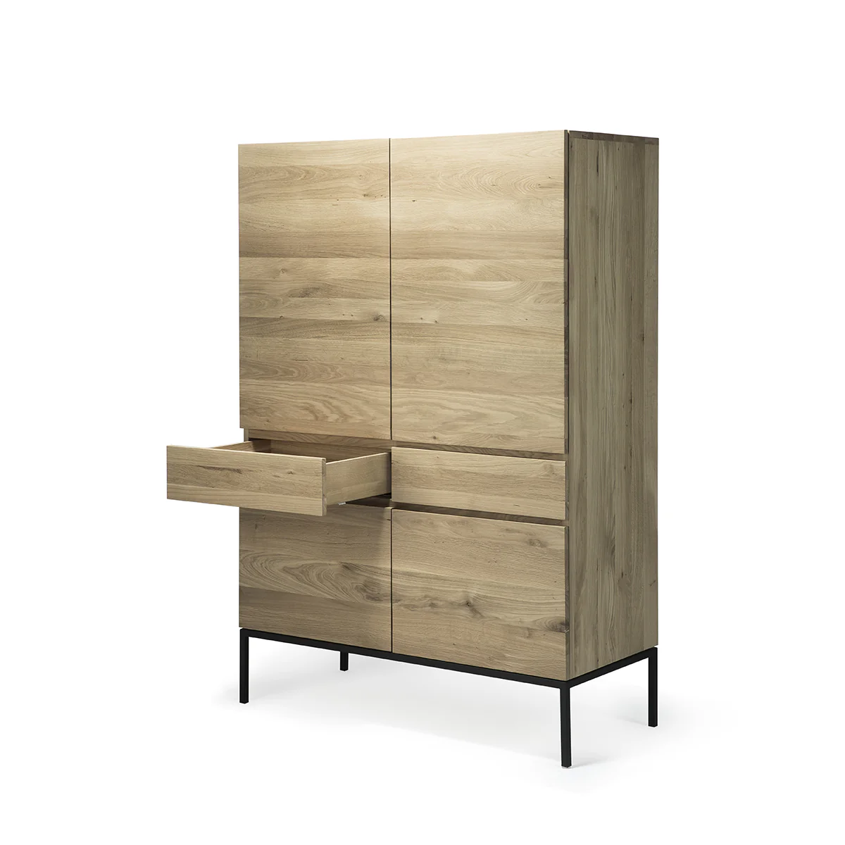 Affirmant un look épuré avec des pieds en métal noir, l'armoire de rangement Ligna en chêne massif offre un rangement parfait pour la cuisine, le salon ou la salle à manger.